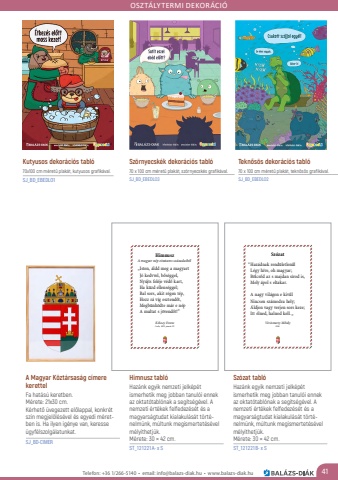 OSZT%u00c1LYTERMI DEKOR%u00c1CI%u00d3A Magyar K%u00f6zt%u00e1rsas%u00e1g c%u00edmere kerettel Fa hat%u00e1s%u00fa keretben. M%u00e9rete: 21x30 cm.K%u00e9rhet%u0151 %u00fcvegezett el%u0151lappal, konkr%u00e9t sz%u00edn megjel%u00f6l%u00e9s%u00e9vel %u00e9s egyedi m%u00e9retben is. Ha ilyen ig%u00e9nye van, keresse %u00fcgyf%u00e9lszolg%u00e1latunkat.SJ_BD-CIMERHimnusz tabl%u00f3Haz%u00e1nk egyik nemzeti jelk%u00e9p%u00e9t ismerhetik meg jobban tanul%u00f3i ennek az oktat%u00f3tabl%u00f3nak a seg%u00edts%u00e9g%u00e9vel. A nemzeti %u00e9rt%u00e9kek felfedez%u00e9s%u00e9t %u00e9s a magyars%u00e1gtudat kialakul%u00e1s%u00e1t t%u00f6rt%u00e9nelm%u00fcnk, m%u00faltunk megismertet%u00e9s%u00e9vel m%u00e9ly%u00edthetj%u00fck. M%u00e9rete: 30 %u00d7 42 cm.ST_121221A- x SSz%u00f3zat tabl%u00f3Haz%u00e1nk egyik nemzeti jelk%u00e9p%u00e9t ismerhetik meg jobban tanul%u00f3i ennek az oktat%u00f3tabl%u00f3nak a seg%u00edts%u00e9g%u00e9vel. A nemzeti %u00e9rt%u00e9kek felfedez%u00e9s%u00e9t %u00e9s a magyars%u00e1gtudat kialakul%u00e1s%u00e1t t%u00f6rt%u00e9nelm%u00fcnk, m%u00faltunk megismertet%u00e9s%u00e9vel m%u00e9ly%u00edthetj%u00fck. M%u00e9rete: 30 %u00d7 42 cm.ST_121221B- x S%u201eIsten, %u00e1ldd meg a magyartJ%u00f3 kedvvel, b%u0151s%u00e9ggel,Ny%u00fajts fel%u00e9je v%u00e9d%u0151 kart,Ha k%u00fczd ellens%u00e9ggel;Bal sors, akit r%u00e9gen t%u00e9p,Hozz r%u00e1 v%u00edg esztend%u0151t,Megb%u00fcnh%u00f6dte m%u00e1r e n%u00e9pA multat s j%u00f6vend%u0151t!%u201dK%u00f6lcsey FerencCseke, 1823. janu%u00e1r 22.HimnuszA magyar n%u00e9p zivataros sz%u00e1zadaib%u00f3lHaz%u00e1dnak rend%u00fcletlen%u0171lL%u00e9gy h%u00edve, oh magyar;B%u00f6lcs%u0151d az s majdan s%u00edrod is,Mely %u00e1pol s eltakar.A nagy vil%u00e1gon e kiv%u0171lNincsen sz%u00e1modra hely;%u00c1ldjon vagy verjen sors keze;Itt %u00e9lned, halnod kell.V%u00f6r%u00f6smarty Mih%u00e1ly1836.Sz%u00f3zat%u201c%u201dKutyusos dekor%u00e1ci%u00f3s tabl%u00f3 70x100 cm m%u00e9ret%u0171 plak%u00e1t, kutyusos grafik%u00e1val.SJ_BD_EBEDLO1Tekn%u0151s%u00f6s dekor%u00e1ci%u00f3s tabl%u00f370 x 100 cm m%u00e9ret%u0171 plak%u00e1t, tekn%u0151s%u0151s grafik%u00e1val.SJ_BD_EBEDLO2Sz%u00f6rnyecsk%u00e9k dekor%u00e1ci%u00f3s tabl%u00f3 70 x 100 cm m%u00e9ret%u0171 plak%u00e1t, sz%u00f6rnyecsk%u00e9s grafik%u00e1val.SJ_BD_EBEDLO3Telefon: +36 1/266-5140 %u2022 email: info@balazs-diak.hu %u2022 www.balazs-diak.hu41