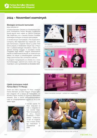 040 FBOMK.hu FBOMK.hu%u00dajabb %u0171rutaz%u00e1sra indult Farkas Berci TV MacijaIsm%u00e9t %u00fatra kelt a legend%u00e1s TV Maci, amelyet Farkas Bertalan, az els%u0151 magyar %u0171rhaj%u00f3s 1980-ban mag%u00e1val vitt a Szojuz%u201336 fed%u00e9lzet%u00e9re. Az ikonikus figura ez%u00fattal az Egyes%u00fclt %u00c1llamokba %u00e9rkezett, ahol a NASA kik%u00e9pz%u0151k%u00f6zpontj%u00e1ban v%u00e1rja az %u0171rhaj%u00f3sjel%u00f6ltekkel egy%u00fctt az Ax%u20134 k%u00fcldet%u00e9s rajtj%u00e1t.A tervek szerint TV Maci 2025-ben ism%u00e9t a vil%u00e1g%u0171rbe indul, ez%u00fattal Kapu Tibor t%u00e1rsas%u00e1g%u00e1ban, az AX%u20134 misszi%u00f3 keret%u00e9ben a Nemzetk%u00f6zi %u0170r%u00e1llom%u00e1sra tart, %u00e9s mag%u00e1val viszi a macit, amely %u00edgy m%u00e1sodszor is visszat%u00e9rhet az %u0171rbe.Biol%u00f3giai %u0171rmisszi%u00f3 bemutat%u00f32024. november 27.A Farkas Bertalan Oktat%u00e1si %u00e9s M%u00f3dszertani K%u00f6zpont munkat%u00e1rsai Farkas Bertalan kutat%u00f3%u0171rhaj%u00f3ssal egy%u00fctt r%u00e9szt vettek az ORION %u0170rnemzed%u00e9k Alap%u00edtv%u00e1ny %u00e9s a Genesis Mission Possible k%u00fcl%u00f6nleges biol%u00f3giai %u0171rmisszi%u00f3-bemutat%u00f3j%u00e1n.A rendezv%u00e9nyen bemutatt%u00e1k a The Exploration Company %u00e1ltal fejlesztett Nyx kapszul%u00e1t, amelyet hamarosan a SpaceX Falcon 9 juttat F%u00f6ld k%u00f6r%u00fcli p%u00e1ly%u00e1ra. A fed%u00e9lzeten helyet kap a MayaSat%u20131 cubesat biol%u00f3giai inkub%u00e1tora, benne 100 gramm n%u00f6v%u00e9nyi maggal. A visszat%u00e9r%u0151 mint%u00e1k vizsg%u00e1lata seg%u00edt felt%u00e1rni, hogyan alkalmazkodhatnak az %u00e9lelmiszern%u00f6v%u00e9nyek az %u0171rbeli k%u00f6rnyezethez, %u00e9s milyen %u00faj lehet%u0151s%u00e9geket nyithatnak meg a j%u00f6v%u0151 hossz%u00fa t%u00e1v%u00fa %u0171rmisszi%u00f3i sz%u00e1m%u00e1ra.A program hangs%u00falyozta az oktat%u00e1s %u00e9s a kutat%u00e1s fontoss%u00e1g%u00e1t, valamint azt a k%u00f6z%u00f6s c%u00e9lt, hogy inspir%u00e1ljuk a j%u00f6v%u0151 gener%u00e1ci%u00f3it az %u0171rkutat%u00e1s ir%u00e1nt.NYX kapszula Projekt bemutat%u00e1sa%u0170rben is termelhet%u0151 n%u00f6v%u00e9nyek %u2013 vertik%u00e1lis farm megtekint%u00e9se Farkas Bertalan k%u00f6sz%u00f6nt%u0151 besz%u00e9de2024 %u2013 Novemberi esem%u00e9nyekB%u00facs%u00fazik a TV Maci, hamarosan %u00fatra indul az %u0171rbe, az ISS-reFot%u00f3: MATTHIAS BALK / dpa Picture-Alliance via AFP