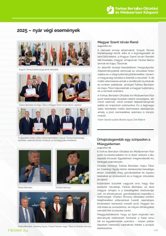 FBOMK.hu FBOMK.hu 045%u0170rhaj%u00f3slegend%u00e1k egy sz%u00ednpadon a M%u0171egyetemen augusztus 28.A Farkas Bertalan Oktat%u00e1si %u00e9s M%u00f3dszertani K%u00f6zpont munkat%u00e1rsaik%u00e9nt mi is r%u00e9szt vett%u00fcnk a Budapesti M%u0171szaki Egyetemen megrendezett k%u00fcl%u00f6nleges esem%u00e9nyen.Charles Simonyi, Farkas Bertalan, Kapu Tibor %u00e9s Cser%u00e9nyi Gyula k%u00f6z%u00f6s kerekasztal-besz%u00e9lget%u00e9sen osztott%u00e1k meg gondolataikat %u00e9s tapasztalataikat az %u0171rutaz%u00e1sr%u00f3l %u00e9s a magyar %u0171rkutat%u00e1s j%u00f6v%u0151j%u00e9r%u0151l.K%u00fcl%u00f6n%u00f6sen b%u00fcszk%u00e9k vagyunk arra, hogy k%u00f6zpontunk n%u00e9vad%u00f3ja, Farkas Bertalan, az els%u0151 magyar %u0171rhaj%u00f3s is a besz%u00e9lget%u00e9s r%u00e9sztvev%u0151je volt, %u00e9s %u00e9lm%u00e9nyeivel, gondolataival inspir%u00e1lta a k%u00f6z%u00f6ns%u00e9get. Charles Simonyi el%u0151ad%u00e1sa szint%u00e9n felejthetetlen pillanatokat hozott: szem%u00e9lyes t%u00f6rt%u00e9netein kereszt%u00fcl mes%u00e9lt arr%u00f3l, hogyan ker%u00fclt k%u00f6zel az %u0171rutaz%u00e1shoz, %u00e9s milyen %u00e9lm%u00e9nyeket szerzett k%u00e9t %u0171rutaz%u00e1sa sor%u00e1n.Meggy%u0151z%u0151d%u00e9s%u00fcnk, hogy az ilyen inspir%u00e1l%u00f3 rendezv%u00e9nyek k%u00fcl%u00f6n%u00f6sen fontosak a fiatal tanul%u00f3k %u00e9s egyetemist%u00e1k sz%u00e1m%u00e1ra %u2013 hiszen p%u00e9ldak%u00e9peken kereszt%u00fcl kaphatnak ihletet a j%u00f6v%u0151j%u00fck alak%u00edt%u00e1s%u00e1hoz. Farkas Bertalan Charles SimonyiFarkas Bertalan, Cser%u00e9nyi Gyula, Charaf Hassan, Kapu Tibor %u00e9s Charles Simonyi 2025 %u2013 ny%u00e1r v%u00e9gi esem%u00e9nyekA d%u00edjazottak Orb%u00e1n Viktor minisztereln%u00f6kkel, Sulyok Tam%u00e1s k%u00f6zt%u00e1rsas%u00e1gi eln%u00f6kkel, valamint K%u00f6v%u00e9r L%u00e1szl%u00f3val, az Orsz%u00e1ggy%u0171l%u00e9s eln%u00f6k%u00e9velSulyok Tam%u00e1s k%u00f6zt%u00e1rsas%u00e1gi eln%u00f6k besz%u00e9deFarkas Bertalan %u00e9s Kapu Tibor a Magyar Szent Istv%u00e1n Rend d%u00edjakkal Magyar Szent Istv%u00e1n Rendaugusztus 20.A nemzeti %u00fcnnep alkalm%u00e1b%u00f3l, Sulyok Tam%u00e1s k%u00f6zt%u00e1rsas%u00e1gi eln%u00f6k adta %u00e1t a legmagasabb %u00e1llami kit%u00fcntet%u00e9st, a Magyar Szent Istv%u00e1n Rendet k%u00e9t kiv%u00e9teles magyar %u0171rhaj%u00f3snak: Farkas Bertalannak %u00e9s Kapu Tibornak. Az %u00e1llamf%u0151 %u00fcnnepi besz%u00e9d%u00e9ben hangs%u00falyozta: %u201eTeljes%u00edtm%u00e9ny%u00fckkel nemcsak az %u0171rkutat%u00e1s hist%u00f3ri%u00e1j%u00e1ba %u00e9s a vil%u00e1g tudom%u00e1nyt%u00f6rt%u00e9net%u00e9be, hanem a magyars%u00e1g sz%u00edv%u00e9be is be%u00edrt%u00e1k a nev%u00fcket.%u201d A d%u00edj m%u00e9lt%u00f3 elismer%u00e9se annak a rendk%u00edv%u00fcli munk%u00e1nak %u00e9s emberi p%u00e9ld%u00e1nak, amelyet Farkas Bertalan %u00e9s Kapu Tibor k%u00e9pviselnek a magyar tudom%u00e1ny %u00e9s a nemzet sz%u00e1m%u00e1ra.A Farkas Bertalan Oktat%u00e1si %u00e9s M%u00f3dszertani K%u00f6zpont k%u00f6z%u00f6ss%u00e9ge b%u00fcszk%u00e9n tekint n%u00e9vad%u00f3j%u00e1ra, aki mind szakmai, mind emberi teljes%u00edtm%u00e9ny%u00e9vel p%u00e9lda %u00e9s inspir%u00e1ci%u00f3 sz%u00e1munkra. Ez a legmagasabb kit%u00fcntet%u00e9s m%u00e9lt%u00f3 elismer%u00e9se %u00e9let%u00fatj%u00e1nak, amely a j%u00f6v%u0151 nemzed%u00e9kei sz%u00e1m%u00e1ra is ir%u00e1nyt%u0171 marad.Fot%u00f3k: S%u00e1ndor-palota (Bartos Gyula, %u00c9rdi R%u00f3bert)