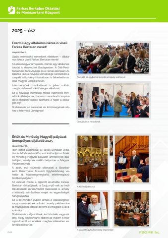 046 FBOMK.hu FBOMK.huA d%u00edjazott Egyh%u00e1zk%u00f6z%u00f6ss%u00e9g k%u00e9pvisel%u0151jeA K%u00fcl%u00f6nd%u00edj %u00e1tad%u00e1sa2025 %u2013 %u0151sz%u00c9rt%u00e9k %u00e9s Min%u0151s%u00e9g Nagyd%u00edj p%u00e1ly%u00e1zat %u00fcnnep%u00e9lyes d%u00edj%u00e1tad%u00f3 2025szeptember 11.Id%u00e9n ism%u00e9t %u00e1tadhattuk a Farkas Bertalan Oktat%u00e1si %u00e9s M%u00f3dszertani K%u00f6zpont k%u00fcl%u00f6nd%u00edj%u00e1t az %u00c9rt%u00e9k %u00e9s Min%u0151s%u00e9g Nagyd%u00edj p%u00e1ly%u00e1zat %u00fcnnep%u00e9lyes d%u00edj%u00e1tad%u00f3j%u00e1n, amelynek m%u00e9lt%u00f3 helysz%u00edne a Magyar Parlament volt.A 2025. %u00e9vi kit%u00fcntet%u0151 oklevelet a Bocskaikerti Reform%u00e1tus Misszi%u00f3i Egyh%u00e1zk%u00f6zs%u00e9g vehette %u00e1t, k%u00f6z%u00f6ss%u00e9gmegtart%u00f3, %u00e9rt%u00e9kmeg%u0151rz%u0151 tev%u00e9kenys%u00e9g%u00e9%u00e9rt.Az oklev%u00e9l mell%u00e9 a d%u00edjazott %u00e1tvehette Farkas Bertalan %u0171rhaj%u00f3j%u00e1nak, a Szojuz%u201336-nak az ind%u00edt%u00f3kulcs%u00e1nak sorsz%u00e1mozott m%u00e1solat%u00e1t is, amely a k%u00fcl%u00f6nd%u00edj szimbolikus erej%u00e9t %u00e9s egyedis%u00e9g%u00e9t hangs%u00falyozza.Ez a d%u00edj minden %u00e9vben annak a k%u00f6z%u00f6ss%u00e9gnek vagy szervezetnek adhat%u00f3, amely p%u00e9ldamutat%u00f3 munk%u00e1j%u00e1val %u00e9rt%u00e9ket teremt %u00e9s meg%u0151rzi a j%u00f6v%u0151 sz%u00e1m%u00e1ra.Gratul%u00e1lunk a d%u00edjazottnak, %u00e9s b%u00fcszk%u00e9k vagyunk arra, hogy k%u00f6zpontunk ebben az %u00e9vben is hozz%u00e1j%u00e1rulhatott az %u00e9rt%u00e9kek megbecs%u00fcl%u00e9s%u00e9hez %u00e9s tov%u00e1bbad%u00e1s%u00e1hoz.Ezent%u00fal egy %u00e1ltal%u00e1nos iskola is viseli Farkas Bertalan nev%u00e9t!szeptember 1.%u00dajabb m%u00e9rf%u00f6ldk%u0151 n%u00e9vad%u00f3nk %u00e9let%u00e9ben %u2013 %u00e1ltal%u00e1nos iskola viseli Farkas Bertalan nev%u00e9t! Az els%u0151 magyar %u0171rhaj%u00f3sr%u00f3l, imm%u00e1r egy %u00e1ltal%u00e1nos iskol%u00e1t is elneveztek Budapesten. A D%u00e9l-Pesti Tanker%u00fclet tan%u00e9vnyit%u00f3ja %u00e9s a Farkas Bertalan %u00c1ltal%u00e1nos Iskola n%u00e9vad%u00f3 %u00fcnneps%u00e9ge keret%u00e9ben a csepeli int%u00e9zm%u00e9ny hivatalosan is felvehette az els%u0151 magyar %u0171rhaj%u00f3s nev%u00e9t.Int%u00e9zm%u00e9ny%u00fcnk munkat%u00e1rsai is jelen voltak, megtisztelve ezt a k%u00fcl%u00f6nleges alkalmat.Ez a n%u00e9vad%u00e1s nemcsak m%u00e9lt%u00f3 elismer%u00e9s n%u00e9vad%u00f3nk %u00e9let%u00fatj%u00e1nak, hanem maradand%u00f3 inspir%u00e1ci%u00f3 is minden kisdi%u00e1k sz%u00e1m%u00e1ra: a hat%u00e1r a csillagos %u00e9g! Gratul%u00e1lunk az iskol%u00e1nak %u00e9s k%u00f6z%u00f6ss%u00e9g%u00e9nek ehhez a felemel%u0151 %u00fcnnephez!Gratul%u00e1ci%u00f3k a n%u00e9vad%u00f3nakAn%u00e9vad%u00f3 %u00e9s egyben az %u00e9vnyit%u00f3 %u00fcnnep%u00e9ly r%u00e9sztvev%u0151i